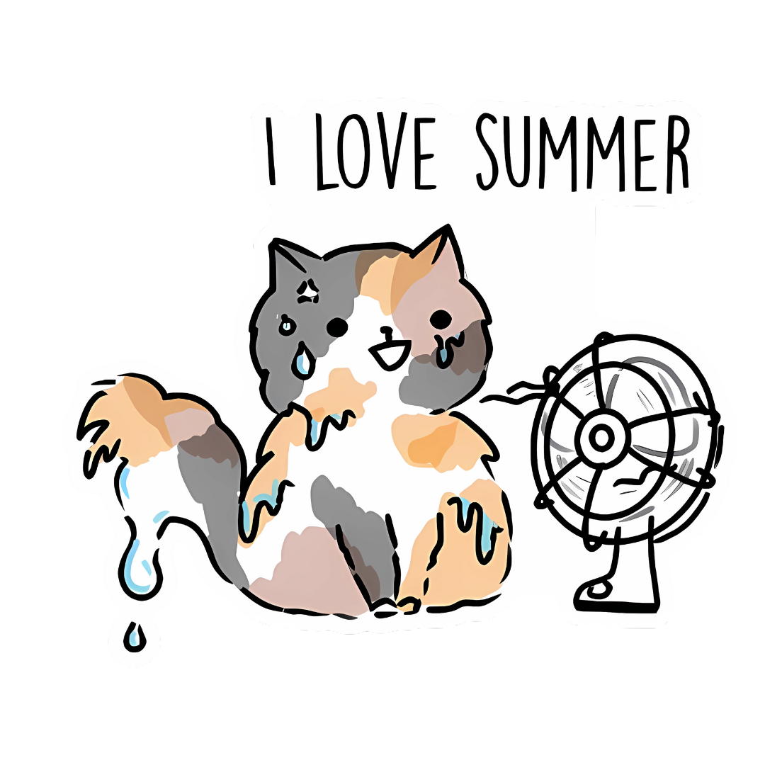 Beat the heat with this adorable (and slightly melty) kitty! This calico cat, dripping in the summer sun while cooling off with a fan, perfectly captures the struggle of loving summer even when it’s way too hot. A funny, relatable design for cat lovers and summer fans alike!