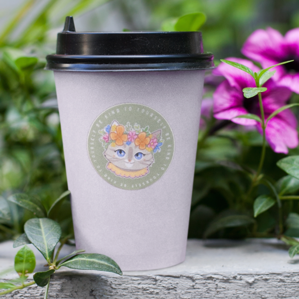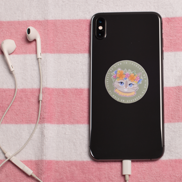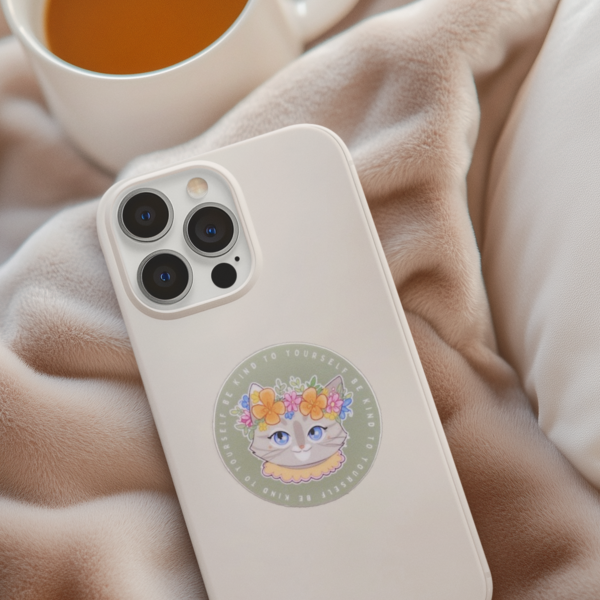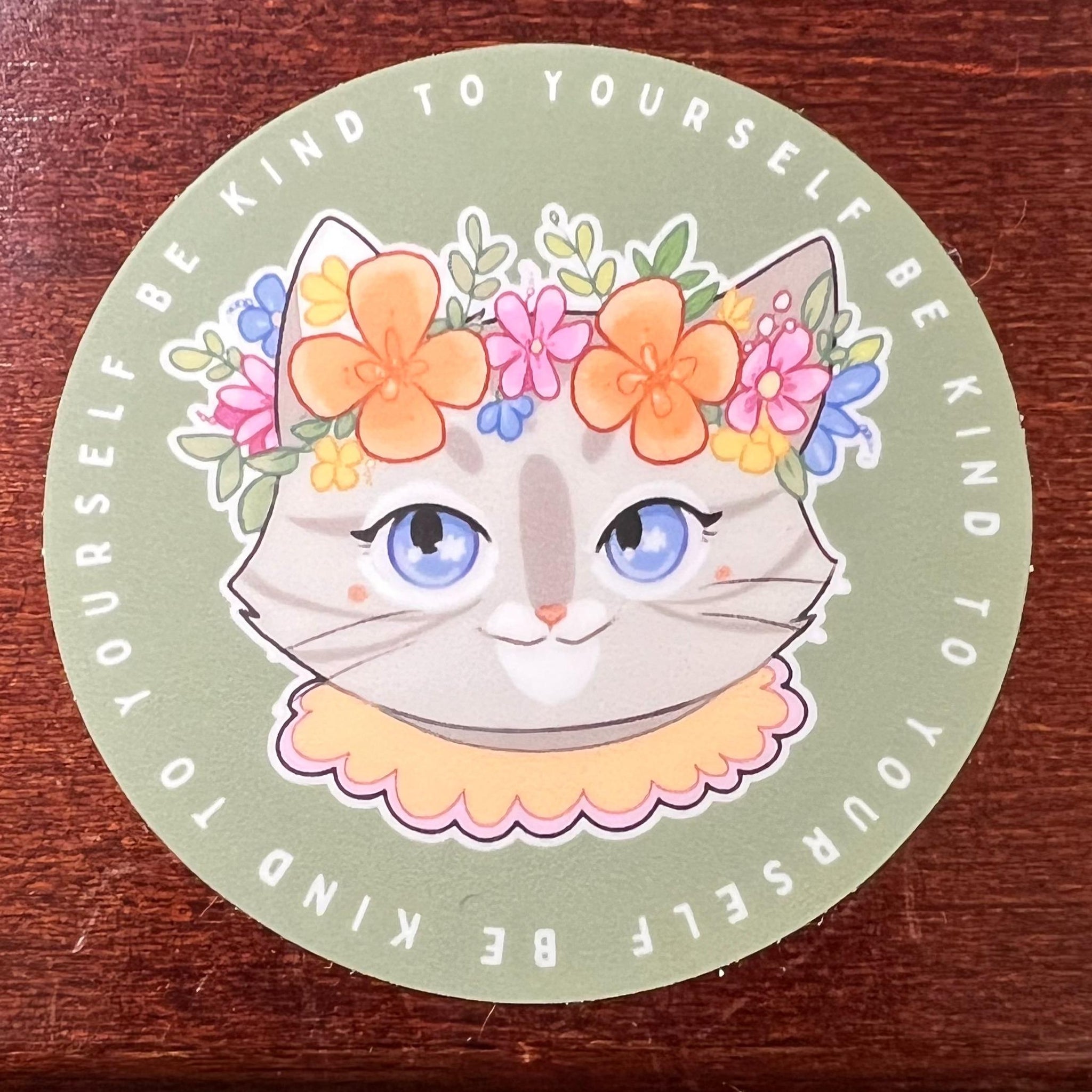 Let Princess Cecily, the flower-crowned feline, remind you to slow down and show yourself some love. This round sticker features the graceful Princess Cecily at its center, wearing her signature flower crown, surrounded by the gentle message "Be Kind to Yourself." A perfect blend of self-care and charm, it serves as a reminder to go easy on yourself, especially when life gets hard.