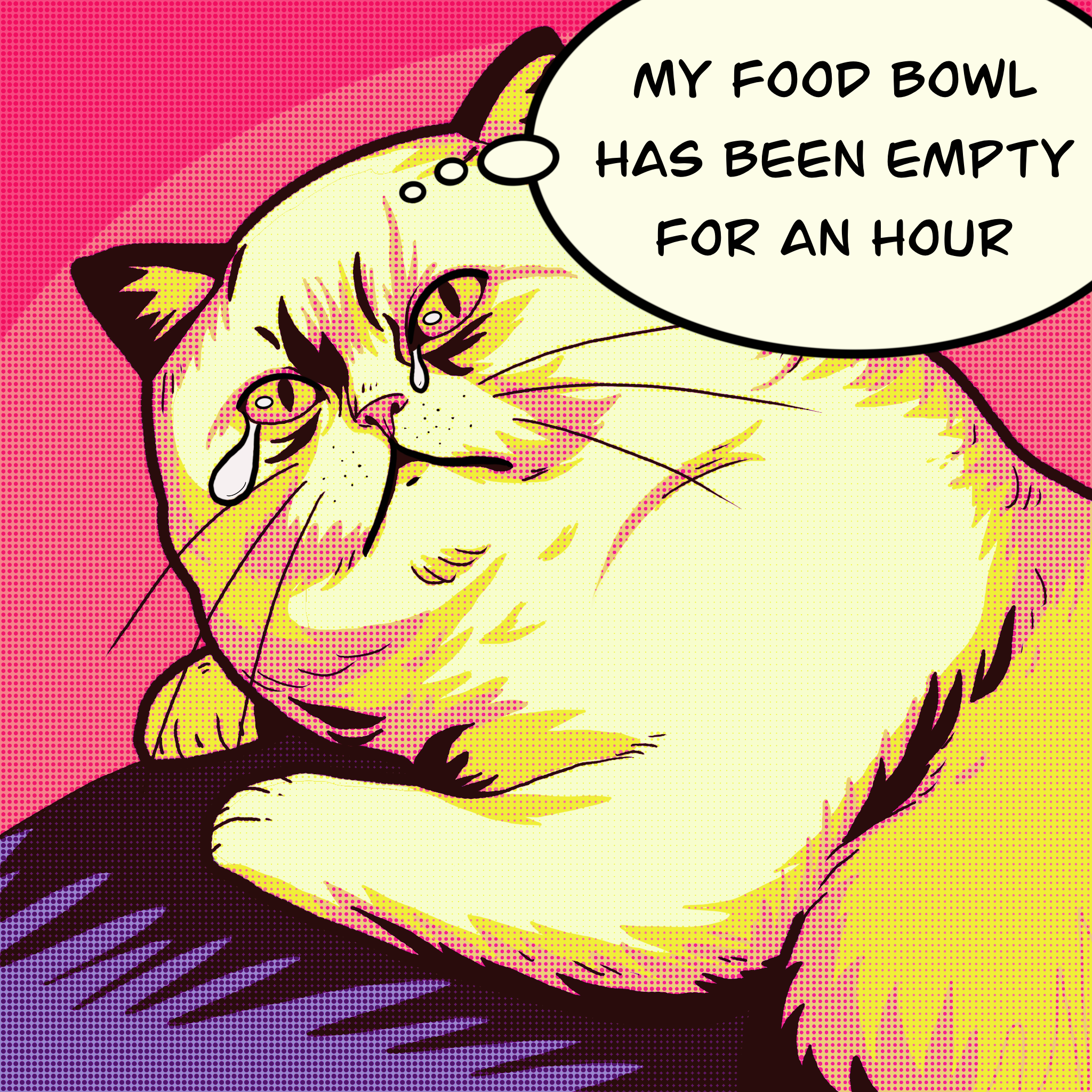 Tragedy. Betrayal. Starvation... or so they claim. This hilariously dramatic sticker features a large, orange cat with a single tear rolling down its cheek, paired with the bold declaration: "My Food Bowl Has Been Empty For An Hour." It’s the ultimate tribute to our melodramatic, food-obsessed feline friends.