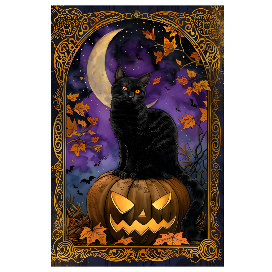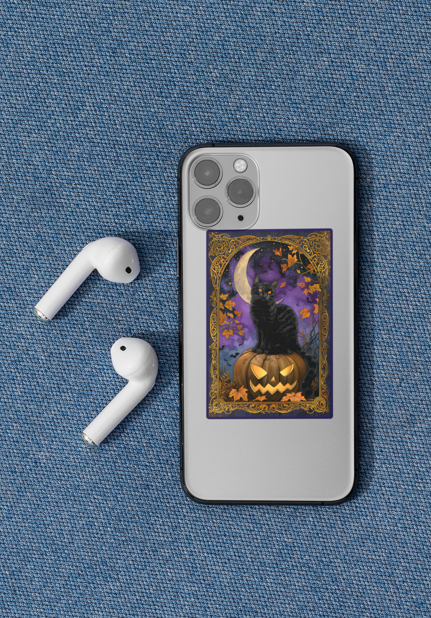 Step into the magic of Halloween night with this enchanting rectangular vinyl sticker. A majestic black cat with glowing amber eyes perches proudly atop a carved jack-o’-lantern, framed by golden scrollwork and surrounded by swirling autumn leaves, a crescent moon, and a starry purple sky. It’s the perfect blend of spooky and elegant—ideal for witches, cat lovers, and lovers of all things mystical.