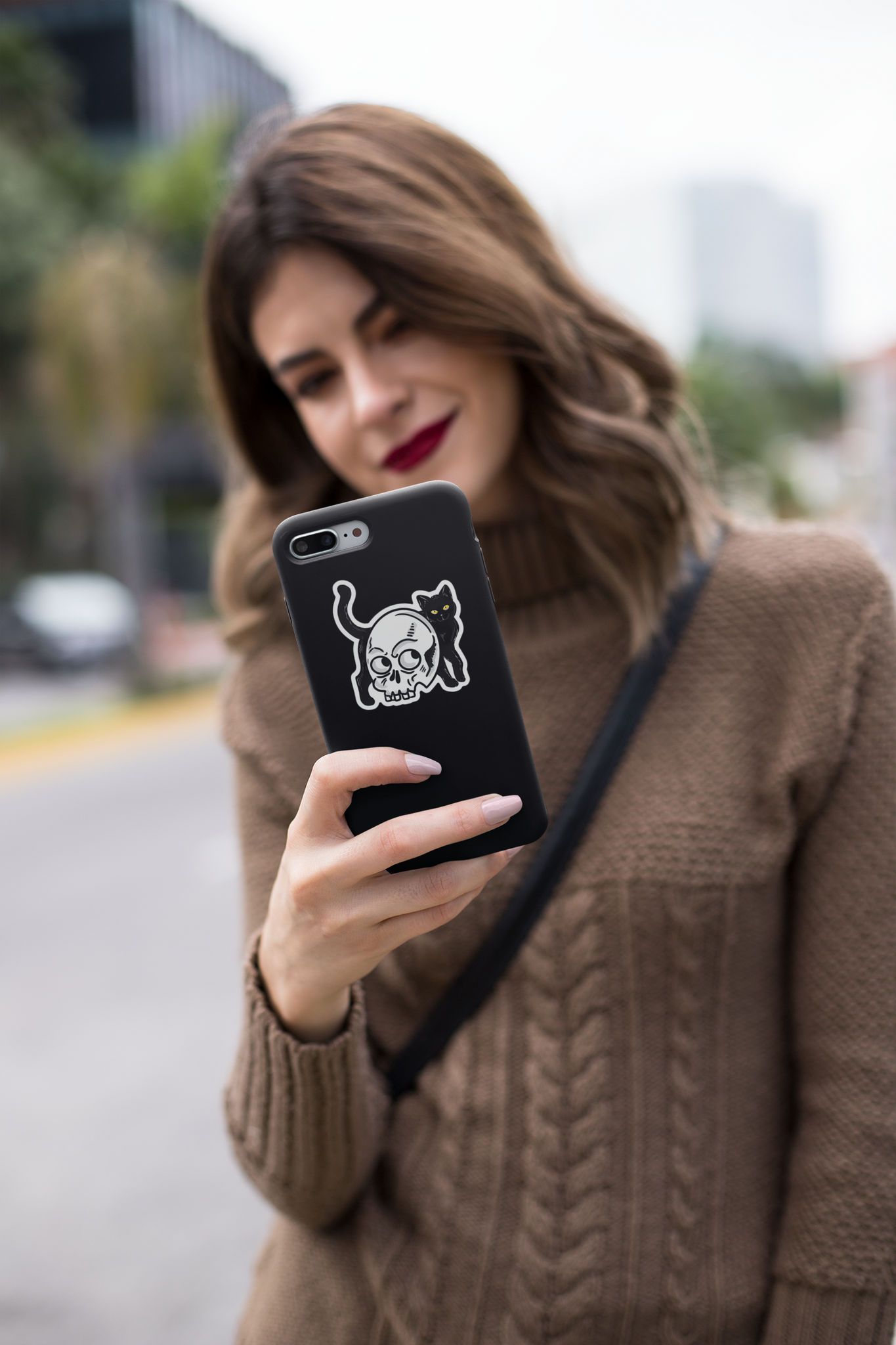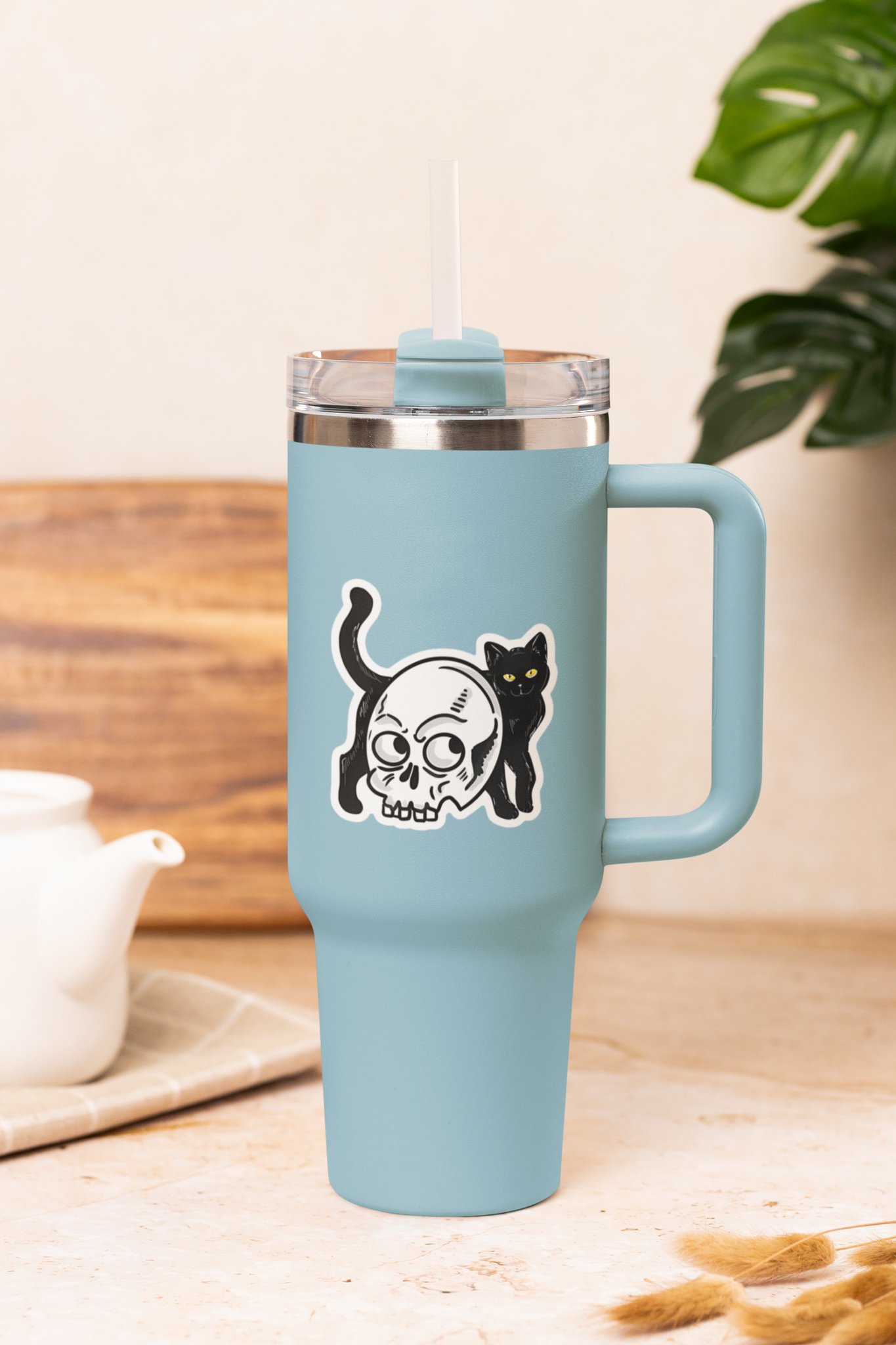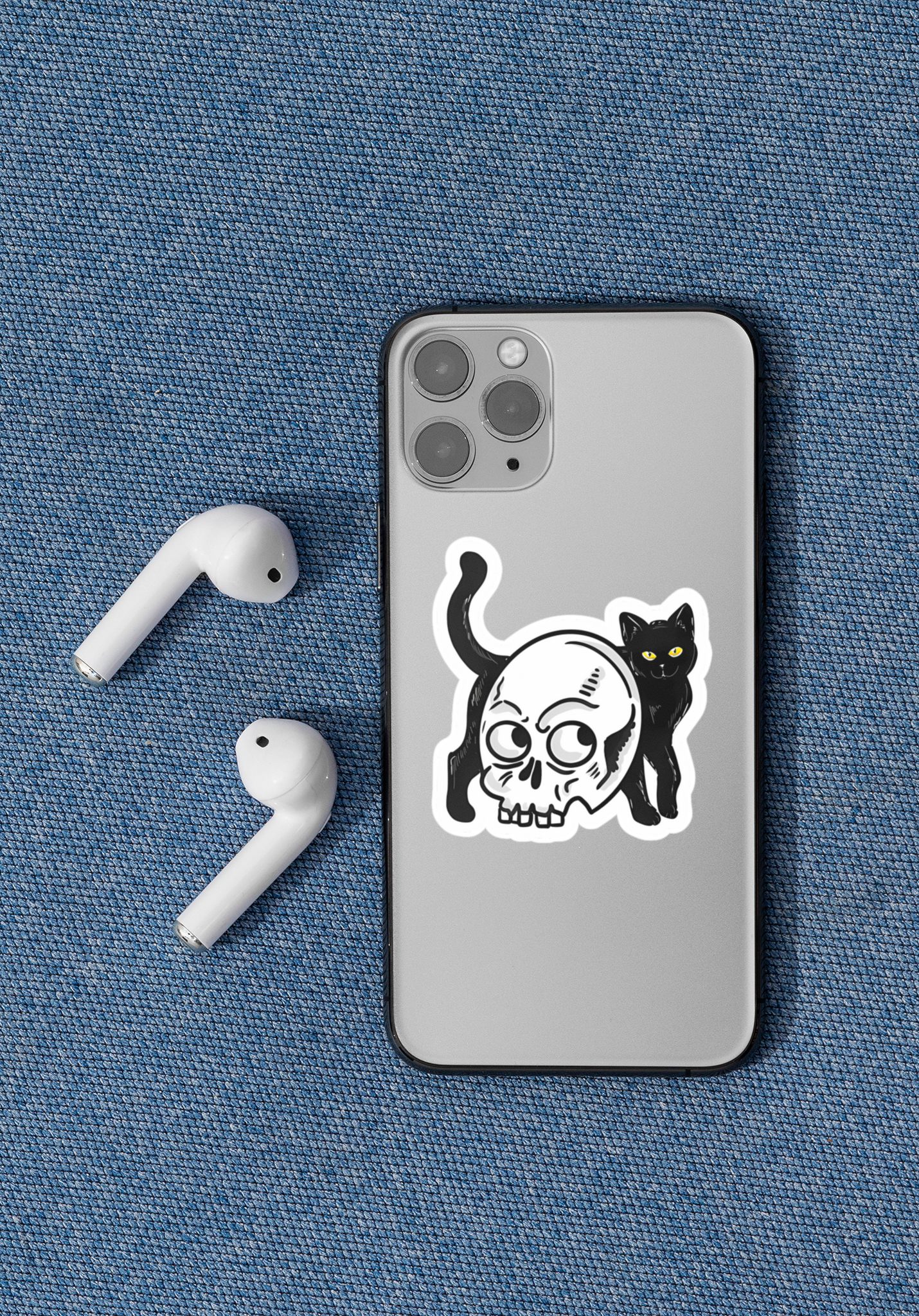Add a touch of spooky charm to your laptop, water bottle, notebook, or wherever you stick your style! This eye-catching vinyl sticker features a wide-eyed skull being adorably photobombed by a sleek black cat with piercing yellow eyes. Equal parts creepy and cute, this bold design is perfect for Halloween lovers, cat fans, and anyone who enjoys a little mischievous magic in their aesthetic.