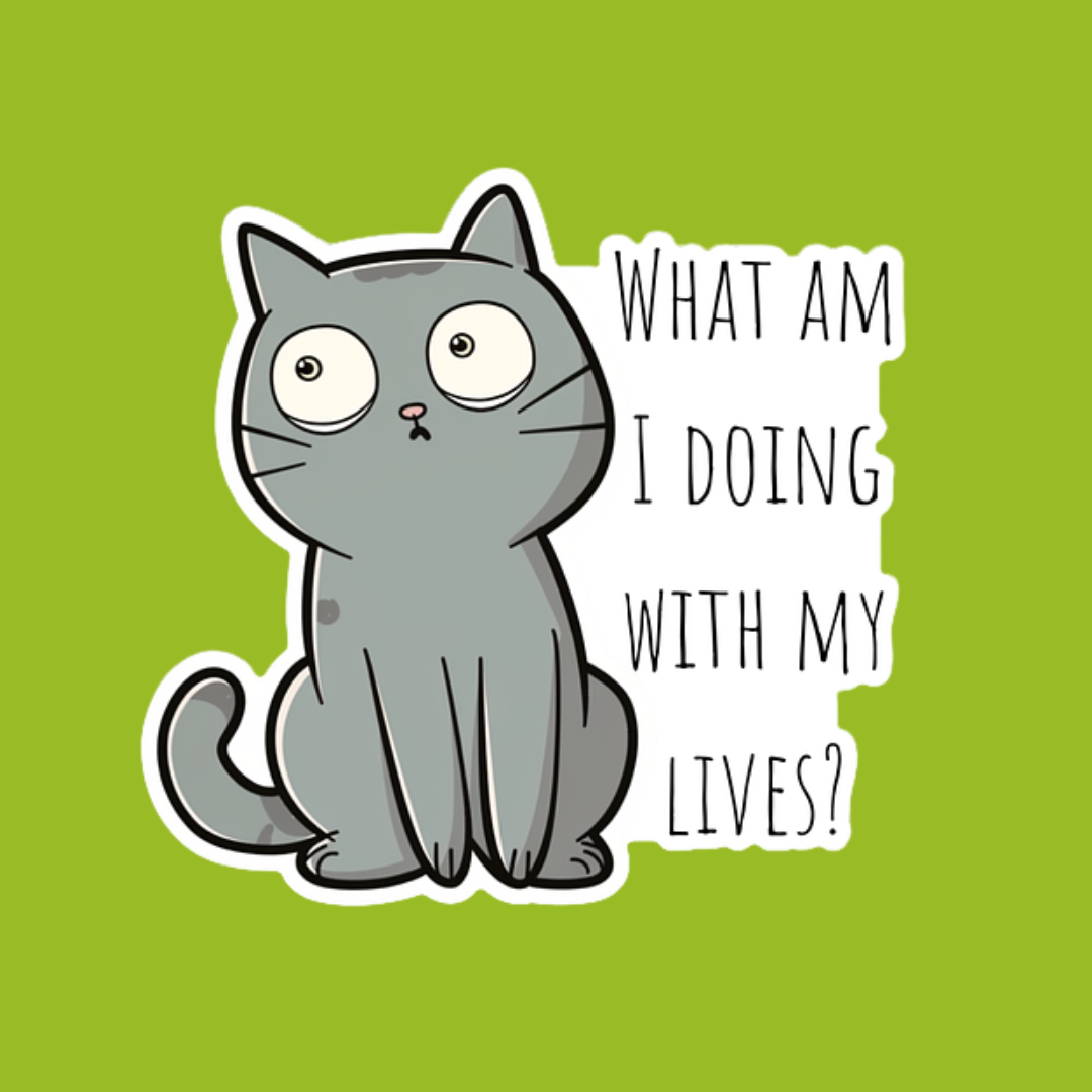 Ever have one of those days where you just… stare into the void and question everything? This hilariously relatable sticker features a wide-eyed gray cat having an existential moment, paired with the phrase “What am I doing with my lives?”—because even cats need a little self-reflection.